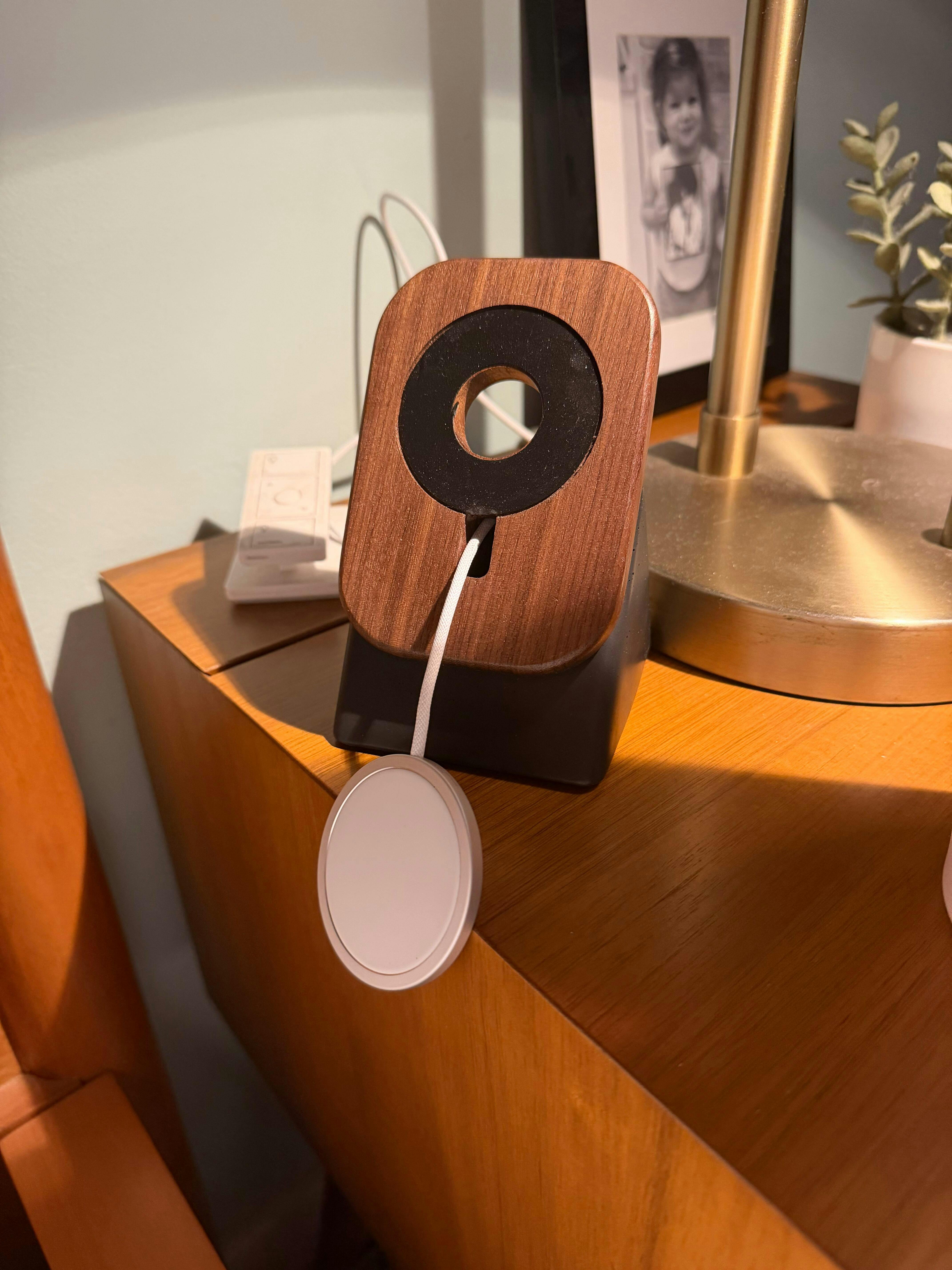 The Upright transforms your existing MagSafe charger into a stable, handcrafted stand made from solid hardwood and concrete.